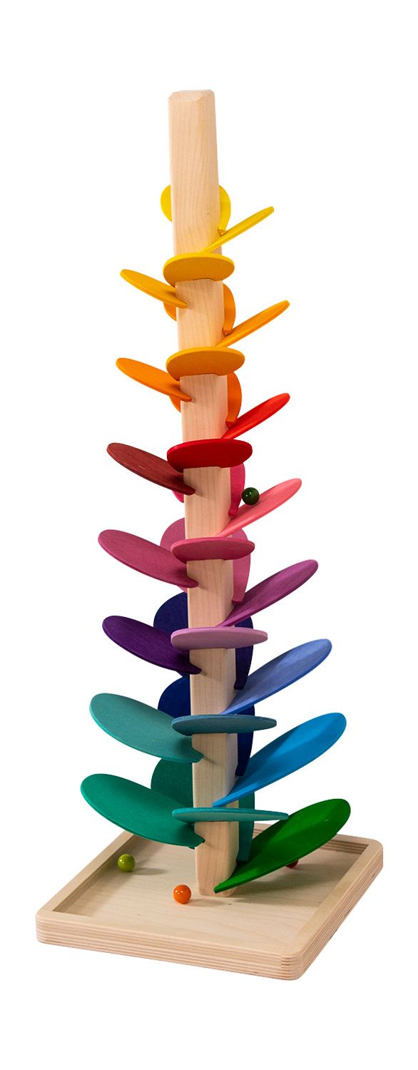 - Farben auf Wasserbasis - eine besondere Kugelbahn für die Sinne - der Klangbaum groß hat eine Höhe von 73 cm - Sockelgröße 25 x 25 cm - in Regenbogenfarben lasiert - Farben von hell (oben) nach dunkel (unten)