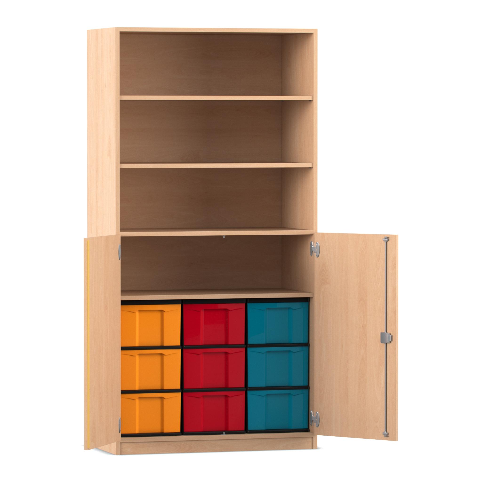 Flexeo® Schrank, Buche hell, 9 große Boxen bunt, 4 Fächer, 2 Halbtüren, HxBxT: 190x94,5x50 cm, Bogengriff mit Schloss
