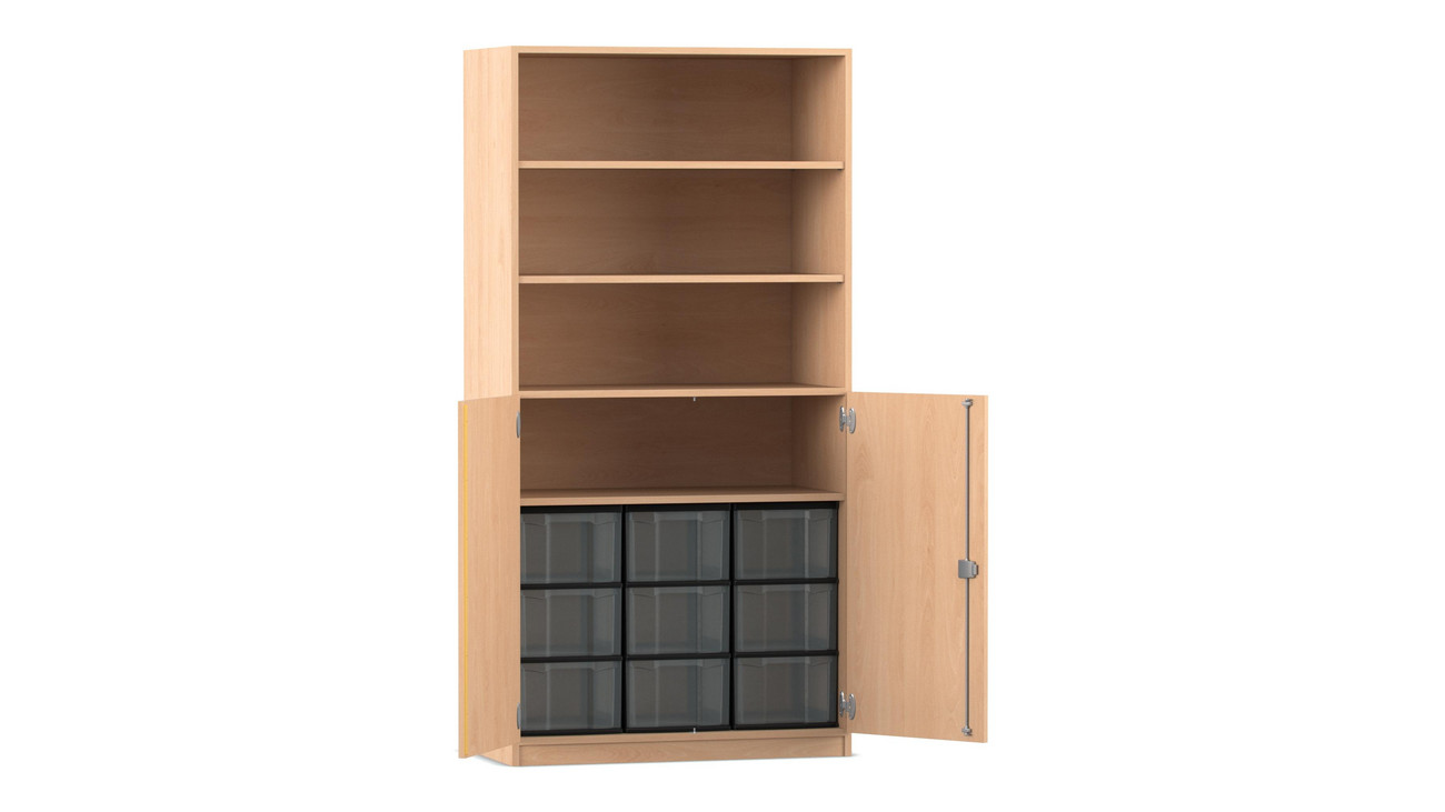 Flexeo® Schrank, Buche hell, 9 große Boxen, 4 Fächer, 2 Halbtüren, HxBxT: 190 x 94,4 x 50 cm