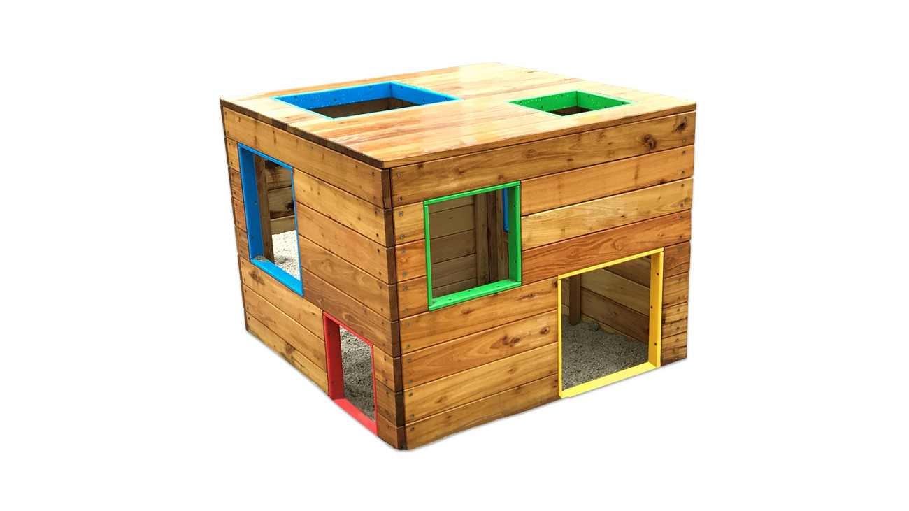 Der große Würfel kann als Rückzugsort und als spannendes Spielhaus an der frischen Luft genutzt werden. Die bodennahen Öffnungen und die vielen anderen bunten Fenster können als Ein- und Ausgang genutzt werden und laden zum Klettern ein. Kinder ab 3 Jahren können sich am und im Spielhaus aus Robinienholz richtig austoben.