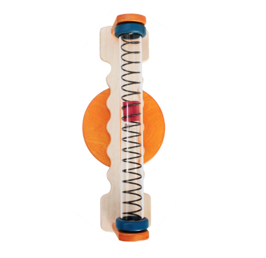 In der Plexiglasröhre befindet sich eine Metallspirale, die drehbar an der Halterung befestigt ist. Durch Umdrehen der Röhre dreht sich ein roter Zylinder gemäß der Fliehkraft, an der Spirale entlang, langsam nach unten. Die Grundplatte wird mit zwei Schrauben an der Wand befestigt.