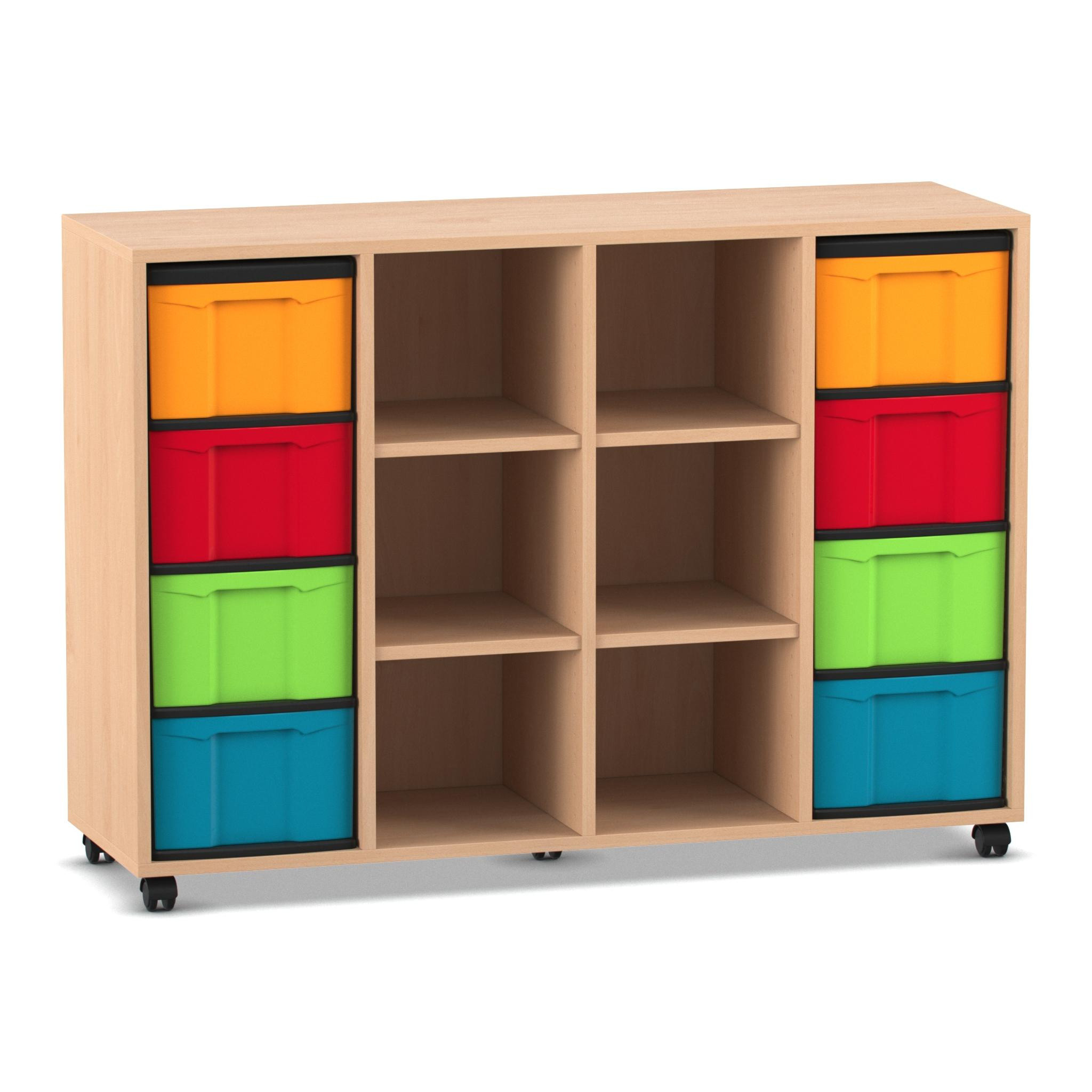 Flexeo Regal, Buche hell, 4 Reihen, 8 große Boxen bunt, 6 Fächer mittig, HxBxT: 92,3 x 130,7 x 40,8 cm, Rollen