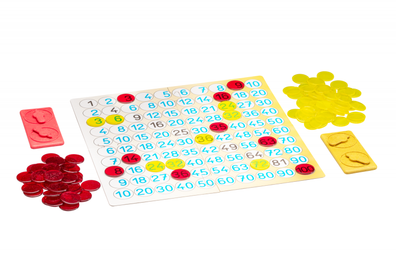 Das aus vier Teilen bestehende Hunderterfeld zusammenfügen und auflegen. Verteilen der Plättchen und Würfel.