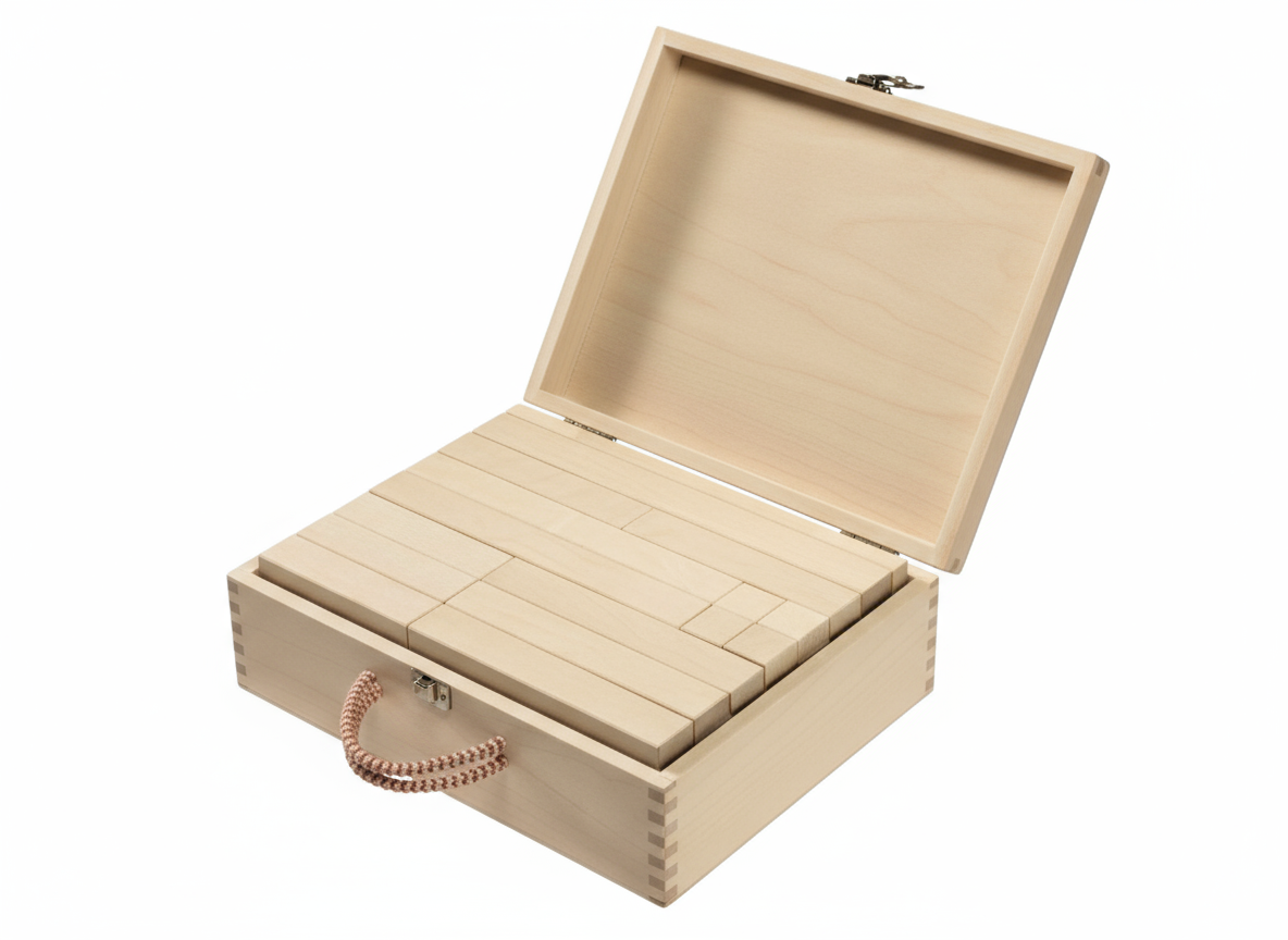 Dieser praktische Bausteinkoffer enthält Bausteine im Quaderbaumaß 33 1/3 mm. Das Grundmaß des Koffers beträgt 36 x 28 x 13 cm und passt für Fröbelbausteine und Quaderbausteine.