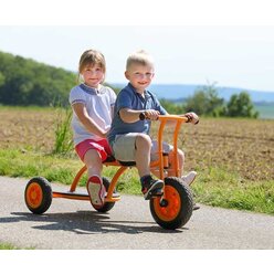 Ab jetzt wird zu zweit durch die Gruppenräume und durch den Garten gesaust! Das Kinder-Taxi mit 2 Sitzplätzen wirkt sich positiv auf die kindliche Entwicklung aus. Durch das Fortbewegen des Fahrzeuges mit den Beinen wird die Beinmuskulatur gestärkt und die Körper-Balance sowie die Motorik gefördert. Der Fahrer muss auf seinen Mitfahrer Acht geben, der Mitfahrer muss ruhig sitzenbleiben und sich gut festhalten. Kommunikation und Einfühlungsvermögen werden hierbei geschult. Der Beifahrer kann seine Füsse bequem auf dem Trittbrett abstellen.