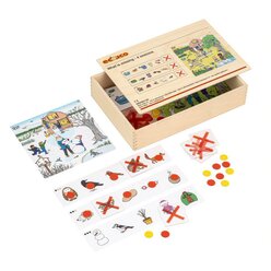 4 Themenblätter aus Kunststoff (20 x 20 cm) 12 Zuordnungsstreifen aus Kunststoff (30 x 6 cm) 12 transparente Plastikkarten mit x (6 x 6 cm) 50 Plastikchips Bedienungsanleitung Holzkiste (33,5 x 22,5 x 7 cm)