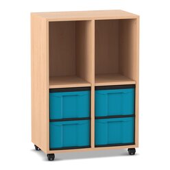 Flexeo® Regal mit 2 Reihen, 2 Fächern und 4 großen Boxen hellblau unten, Rollen