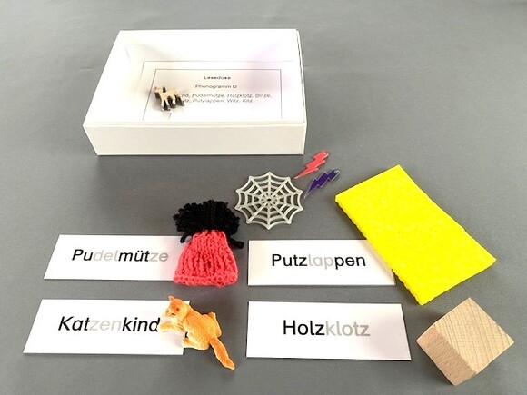13 Pappdosen (17 x 13 x 4 cm), 104 kleine Gegenstände, 104 Namenkärtchen in Silbenschrift
